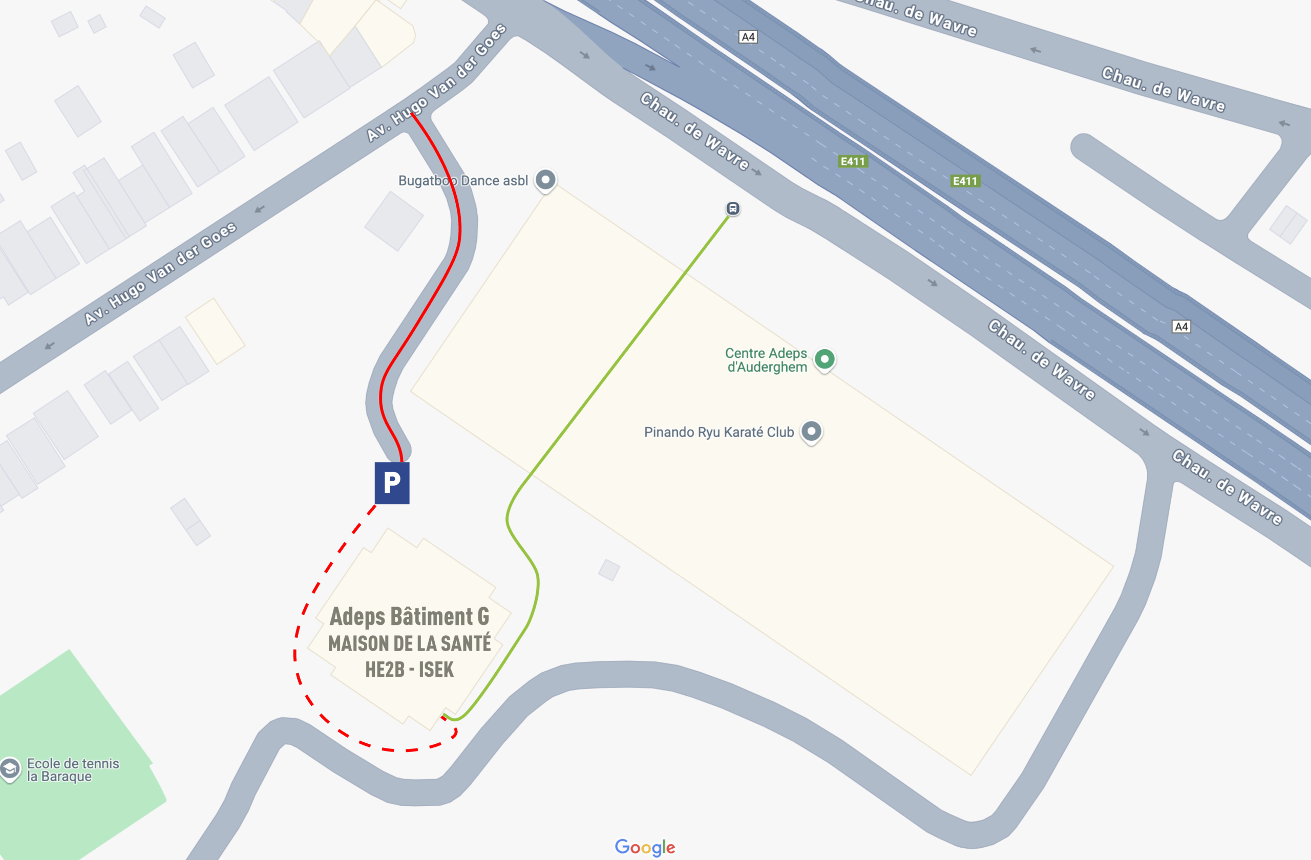 Le Centre de Santé HE2B-ISEK est facilement accessible grâce à un parking gratuit (entrée côté avenue H. Van Der Goes) ou au bus 72 (entrée chaussée de Wavre).